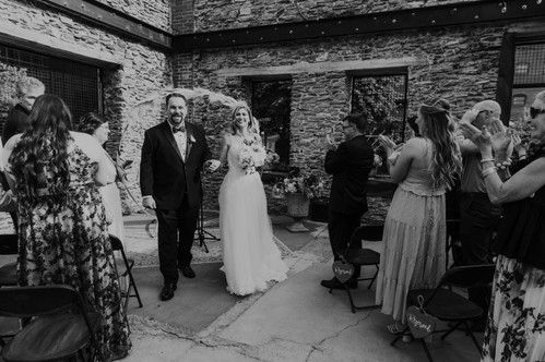 Sean had gotten ready with friends across town but was able to make it before the ceremony to have a quick first look and share a moment with his beautiful bride. Sean also had an incredible vest made by his mother and a bowtie made of feathers. The couple was so purposeful with all the details on their special day.